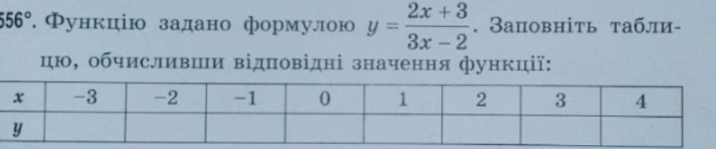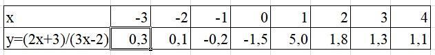 просто у формулу замість х підставити числа з верхнього рядку. для (-3) у=(2*(-3)+3)/(3*(-3)-2)=(-3)/(-11)=3/11. для 0 у=(2*0+3)/(3*0-2)=3/(-2)=-1,5