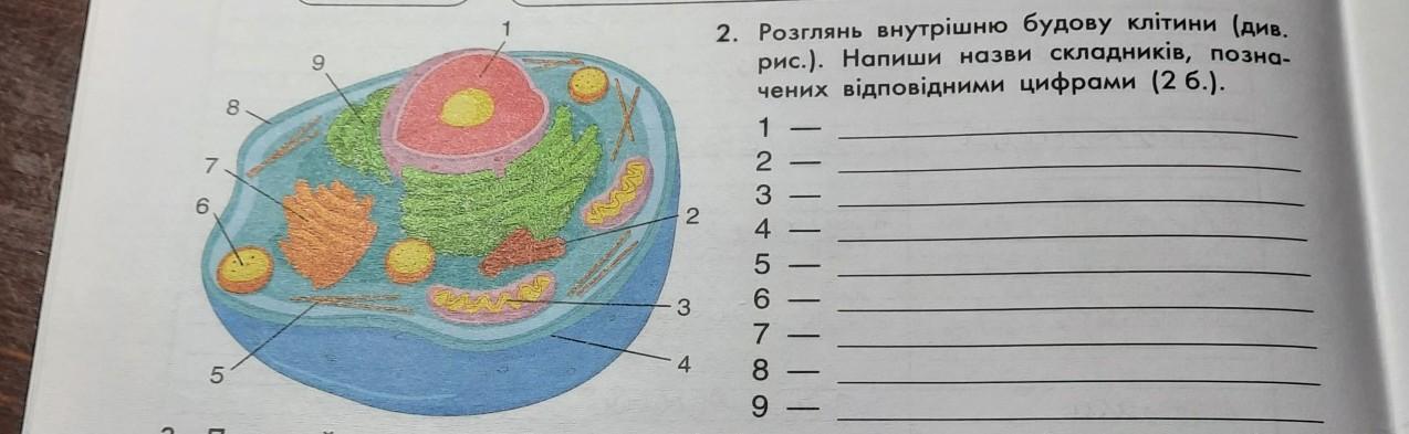 2. Розглянь внутрішню будову клітини (див. рис.). Напиши назви складників, позна- чених відповідними цифрами