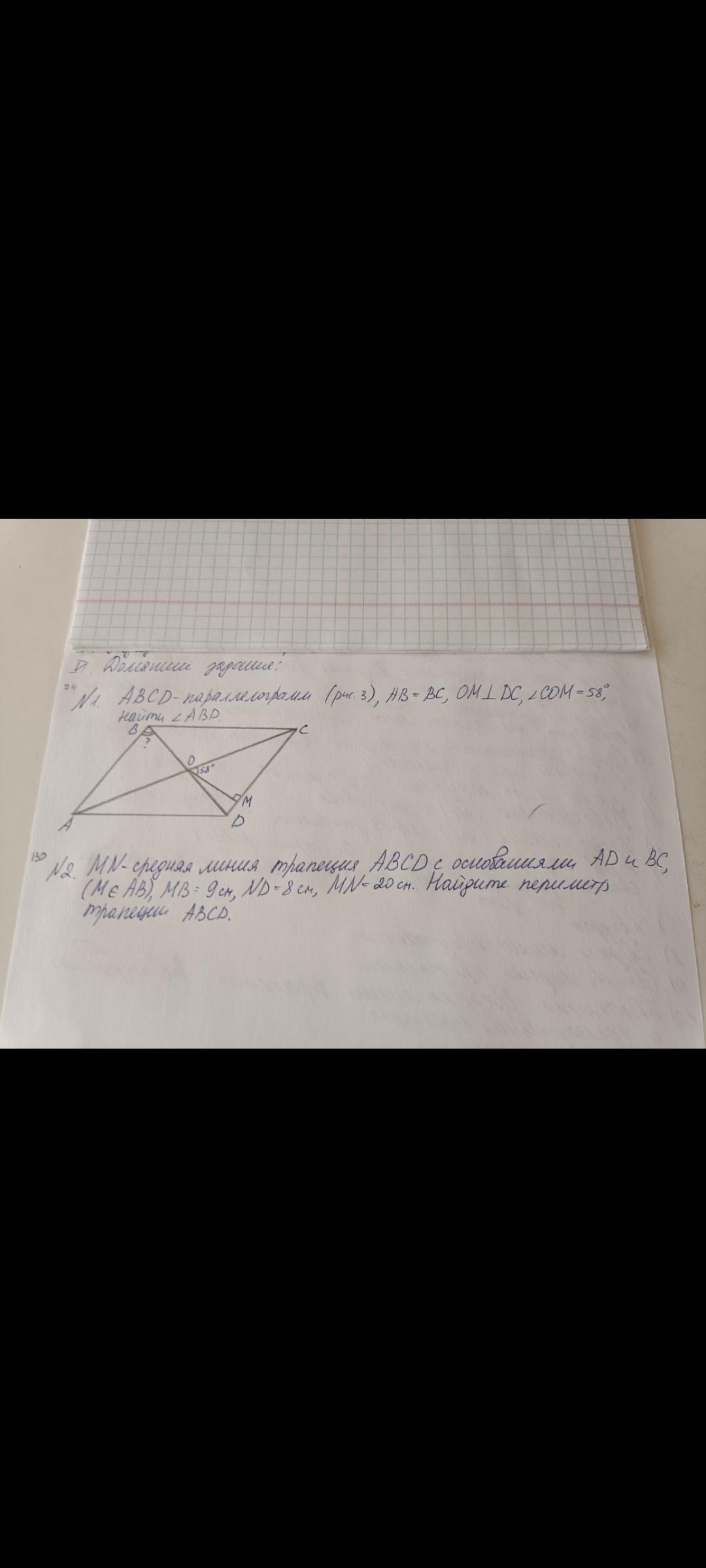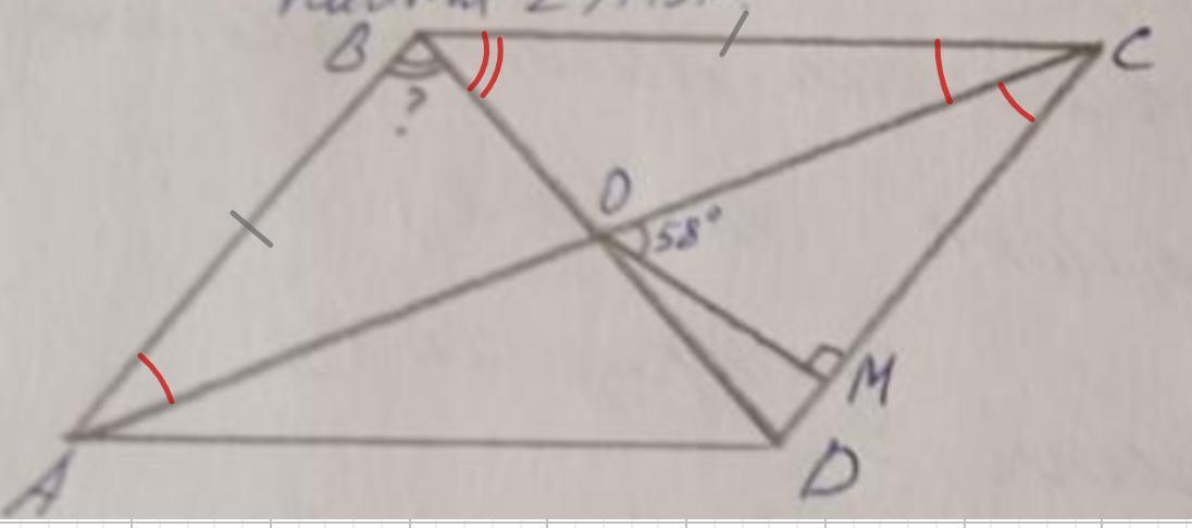 1. ABCD - параллелограмм. АВ = ВС, ОМ ⊥ DC, ∠СОМ = 58°. Найти ∠ABD.