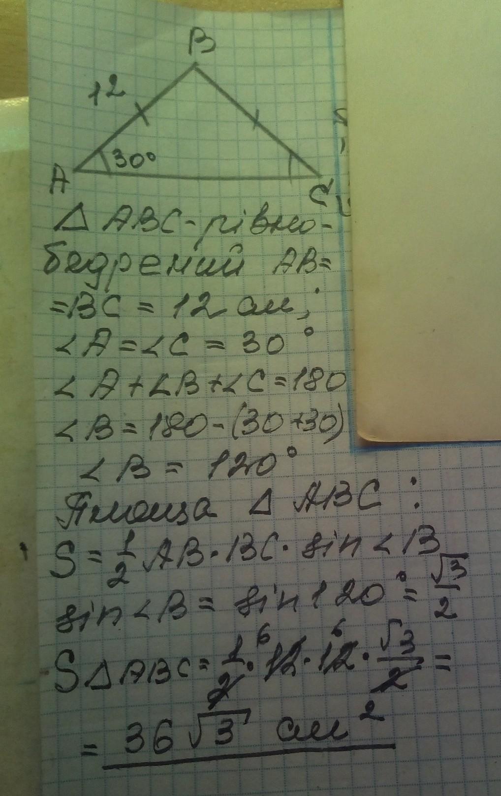 площу рівнобедреного трикутника якщо його бічна сторона дорівнює 12 см а кут при основі 30°
