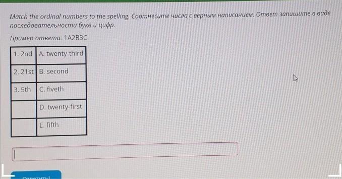 Match the ordinal numbers to the spelling. Соотнесите числа с верным написанием. Ответ запишите в виде последовательности букв и цифр.