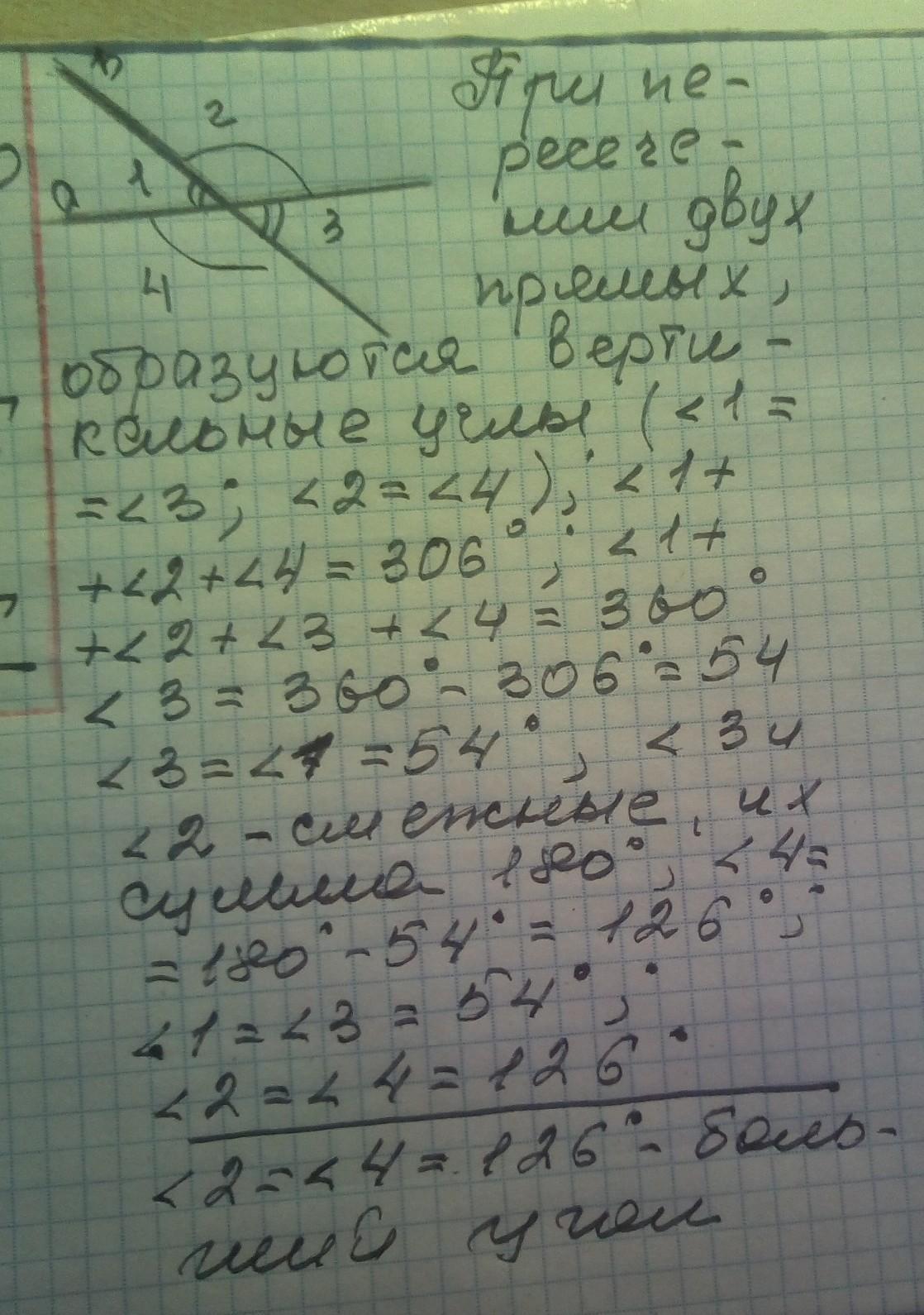 Сумма трёх углов, образованных при пересечении двух прямых, равна 306°. Найдите больший из них.