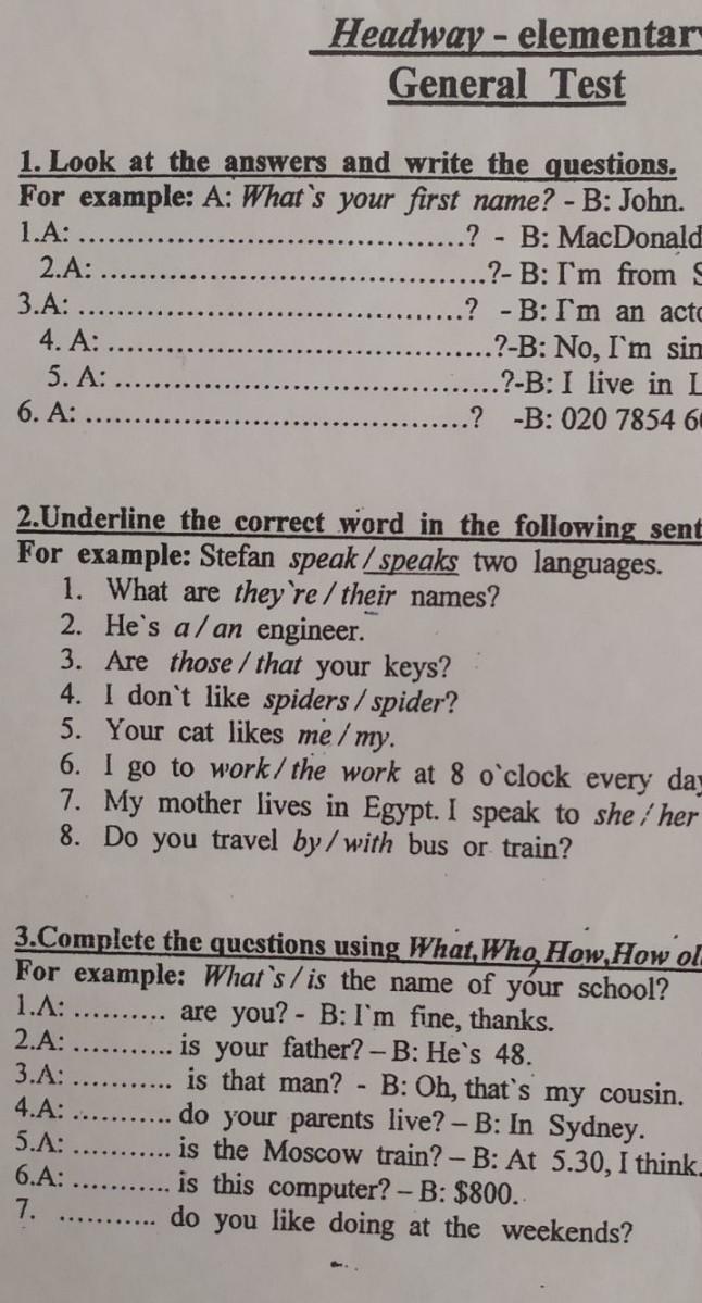 1. Look at the answers and write the questions. For example: A: What's your first name? - B: John.