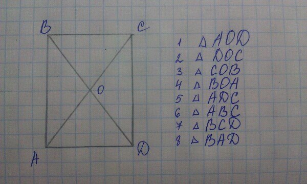 Начерти прямоугольник ABCD со сторонами 3 см и 4 см.Проведи в нём два отрезка так,чтобы получилось 8 треугольников.Обозначь буквой О точку пересечения отрезков.