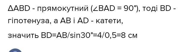 Знайдіть діагональ BD чотирикутника ABCD, якщо кут B а де дорівнює 90 °, кут аби дебе = 30 ° і AB= 4 см