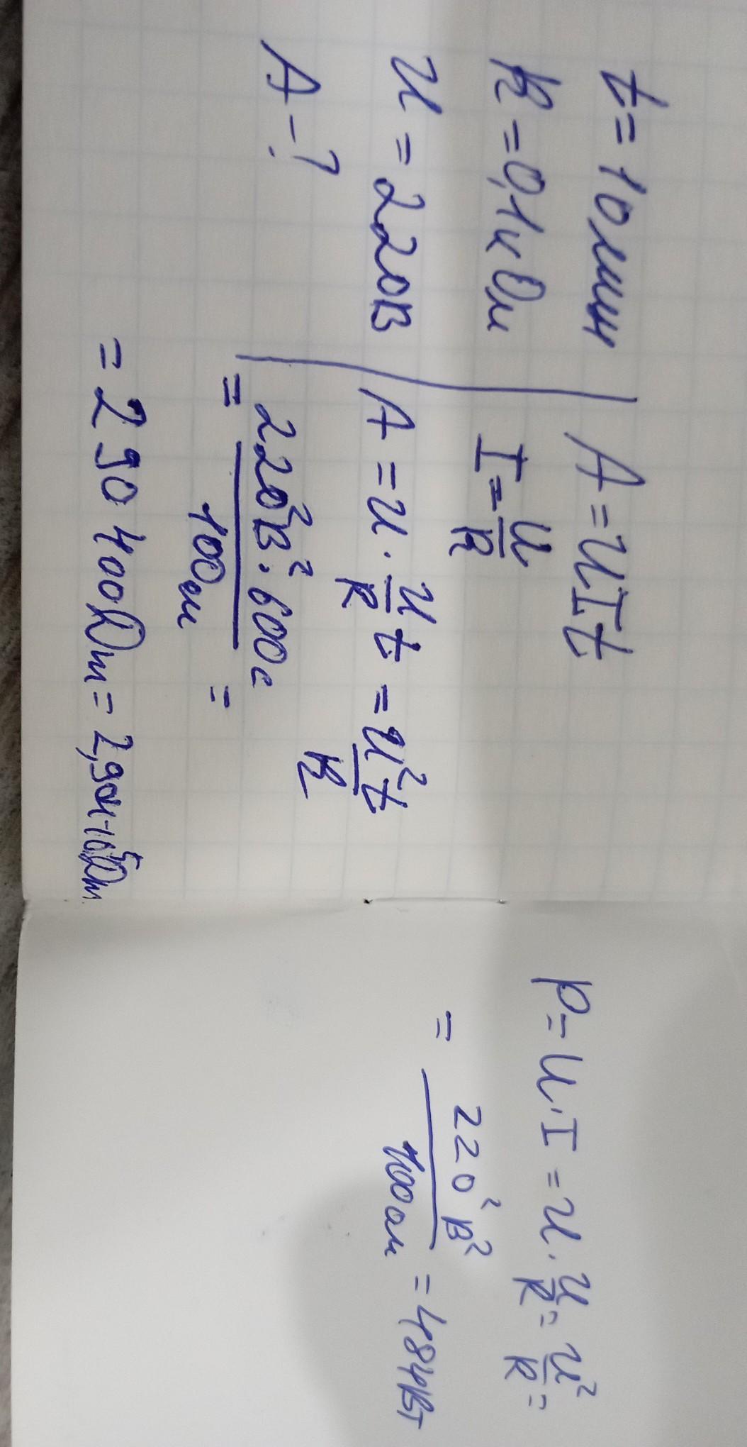 Визначити роботу електричного струму за 10хв в лампі, опором 0,1кОм, що включена в мережу 220В. Чому дорівнює потужність лампи?