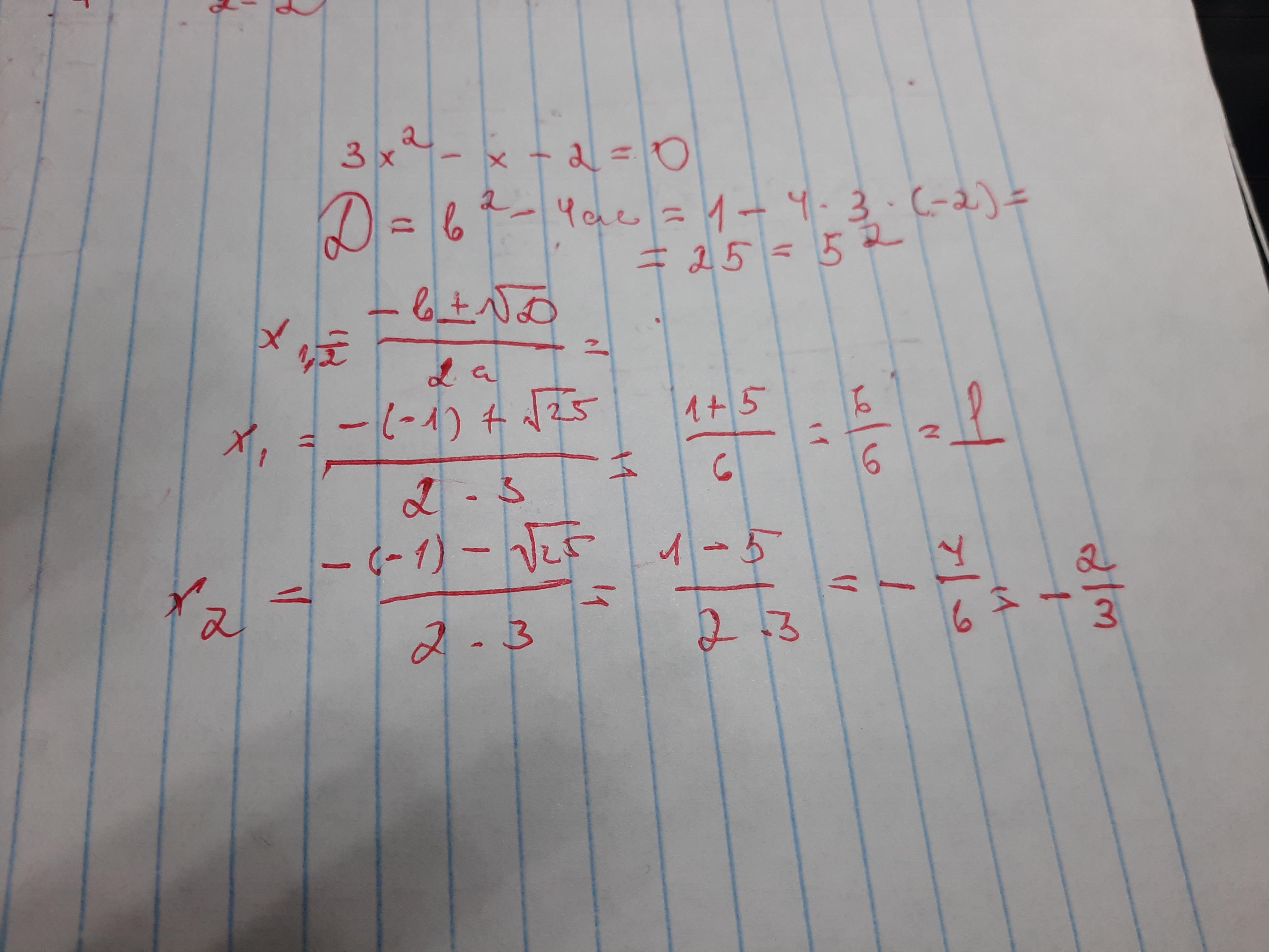 D = (-1)² - 4 · 3 · (-2) = 1 + 24 = 25