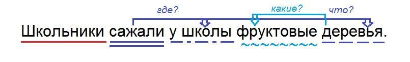 Школьники сажали (=) у школы (-.-.-) фруктовые (~~~) деревья (---).
