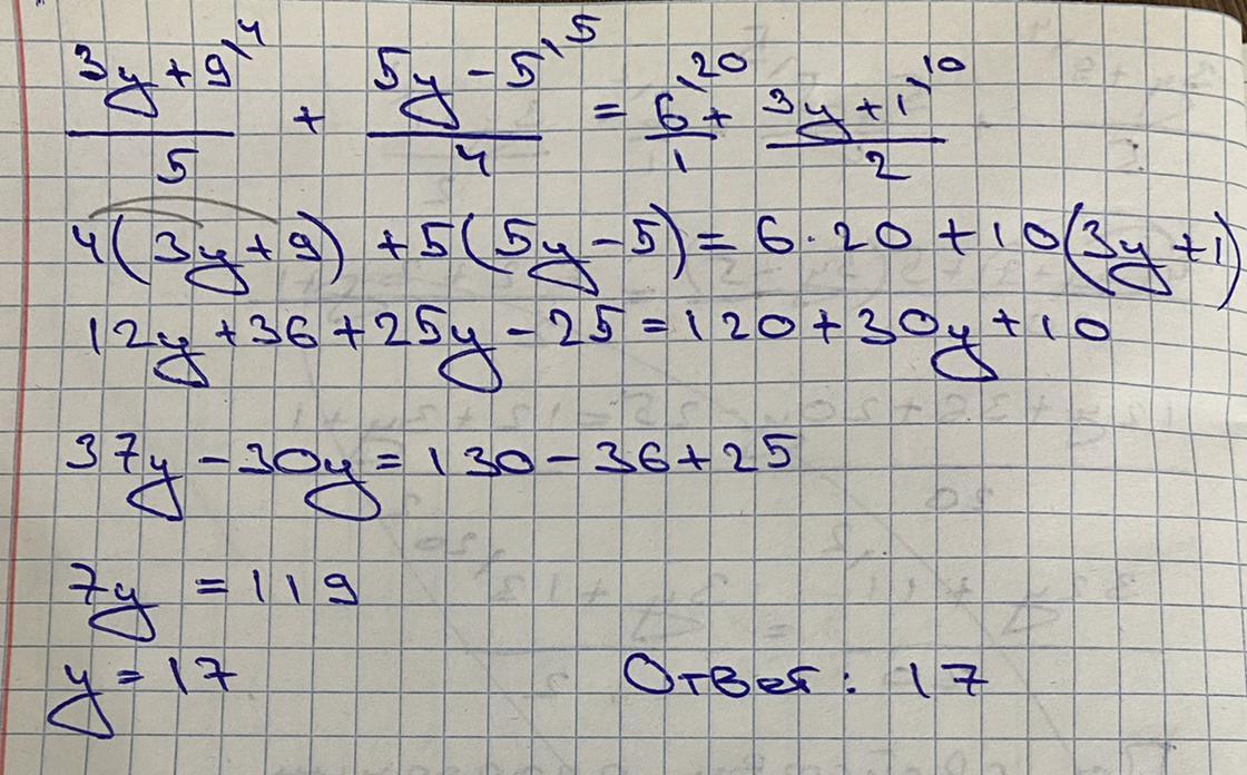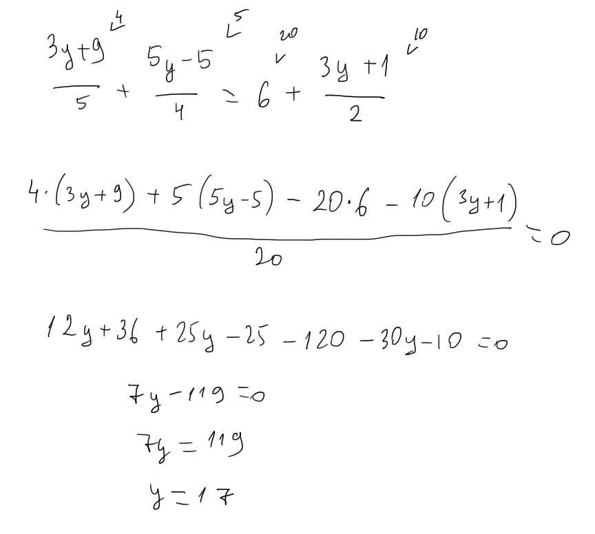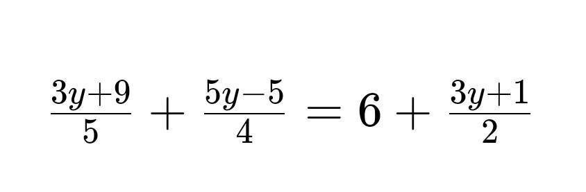 Можно расписать решения на тетради. Я посмотрел решение, но там не понятное решение. Я не понял именно последнию часть. 6 + 3y+1/2 на сайте где написано решение там нашли общий знаменатель 20 и 10 но это слишком много.