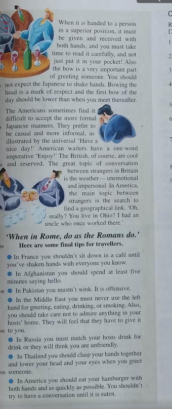 Когда европейское сообщество стало разрастаться, появилось несколько руководств по интернациональному этикету. Сначала многие люди подумали, что это шутка, в первую очередь британцы, которые, кажется, решили, что повсеместное понимание их языка их языка предполагало соответствующее понимание английских традиций. Очень скоро им пришлось изменить свое мнение, так как они поняли, что им самим предстояло многое узнать о том, как общаться со своими иностранными партнерами по бизнесу.
