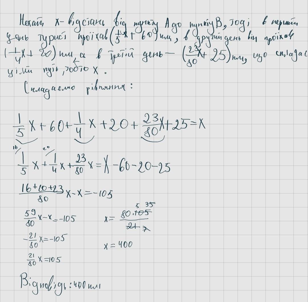 Турист доехал из пункта А в пункт В за 3 дня. В первый день он проехал 1/5 часть всего пути и ещё 60 км, во второй - 1/4 часть пути и ещё 20 км, а в третий день - 23/80 всего пути и оставшиеся 25 км. Найдите расстояние между пунктами А и В.