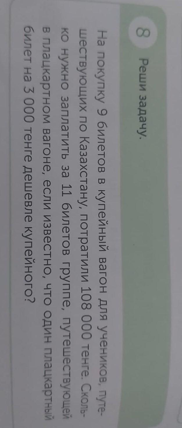 8 Реши задачу. На покупку 9 билетов в купейный вагон для учеников, путе- шествующих по Казахстану, потратили 108 000 тенге. Сколь- ко нужно заплатить за 11 билетов группе, путешествующей в плацкартном вагоне, если известно, что один плацкартный билет на 3 000 тенге дешевле купейного?. краткое условие пожалуйста