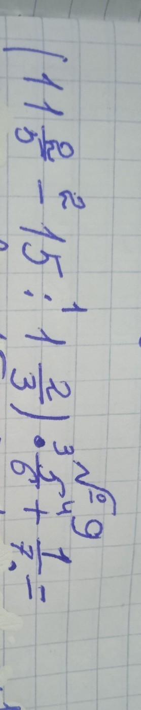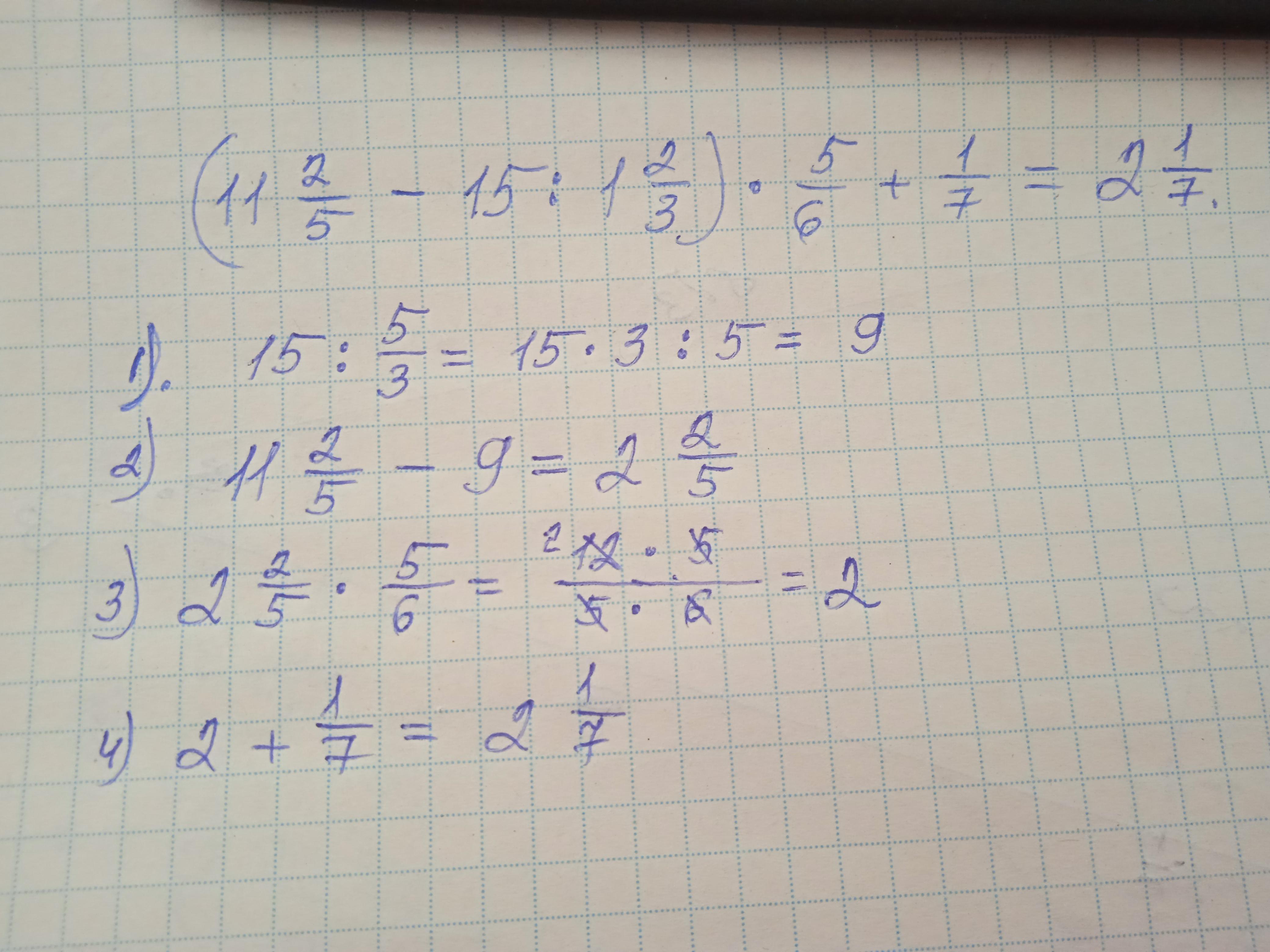 (11 2/5-15:1 2/3)*5/6+1/7 решите по действиям на фото виден пример пожалуйста срочно даю 50балов