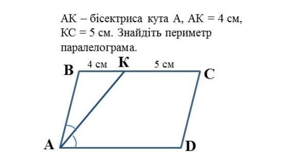 Бісектриса кута паралелограма відсікає від нього рівнобедрений трикутник (AK - бісектриса ⇒ ∠BAK = ∠KAD, тоді ∠KAD = ∠KAB як навхрест лежачі кути, що лежать при AD || BC і січної АК.