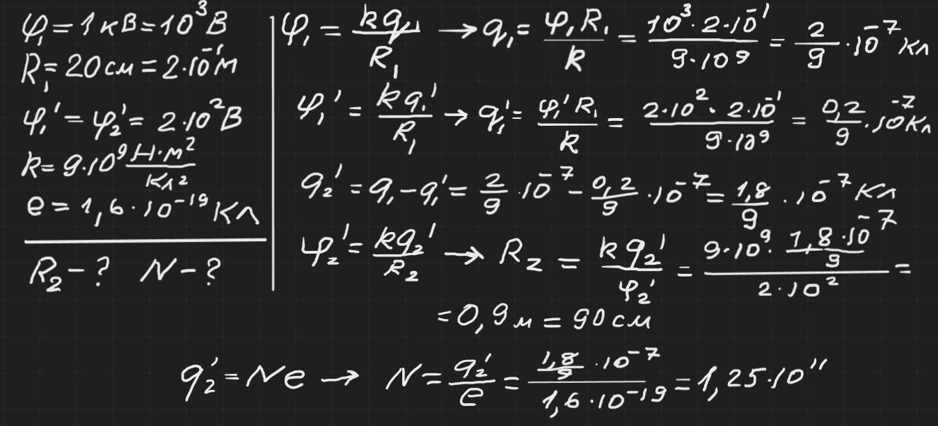 Заряджену до потенціалу 1 кВ кулю радіусом 20 см з’єднали із незарядженою кулею довгим провідником. У результаті потенціал куль виявився рівним 200 В. Знайти радіус кулі, яка була незарядженою. Яка кількість електронів
