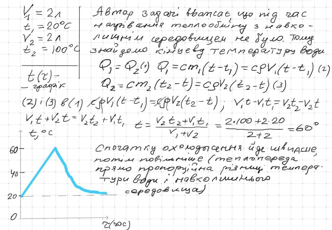 Каструля містить 2 л води за температури 20°С. Температура навколишнього повітря також дорівнює 20°С. У кастрюлю потроху доливають 2 л окропу, температура якого становить 100°С. Побудуйте приблизний графік залежності температури води в кастрюлі від часу. Урахуйте, що після нагрівання води відбувається теплообмін між нею та навколишнім середовищем.