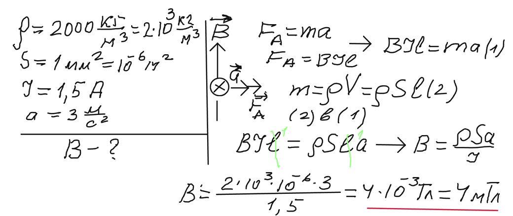 У вертикальному однорідному магнітному полі на гладенькій горизонтальній поверхні перебуває циліндричний провідник, густина матеріалу якого 2000 кг/м3, а площа поперечного перерізу 1 мм2. Після того як по провіднику пропустили струм силою 1,5 А, він починає рухатися з прискоренням 3 м/с2. Якою є магнітна індукція поля?