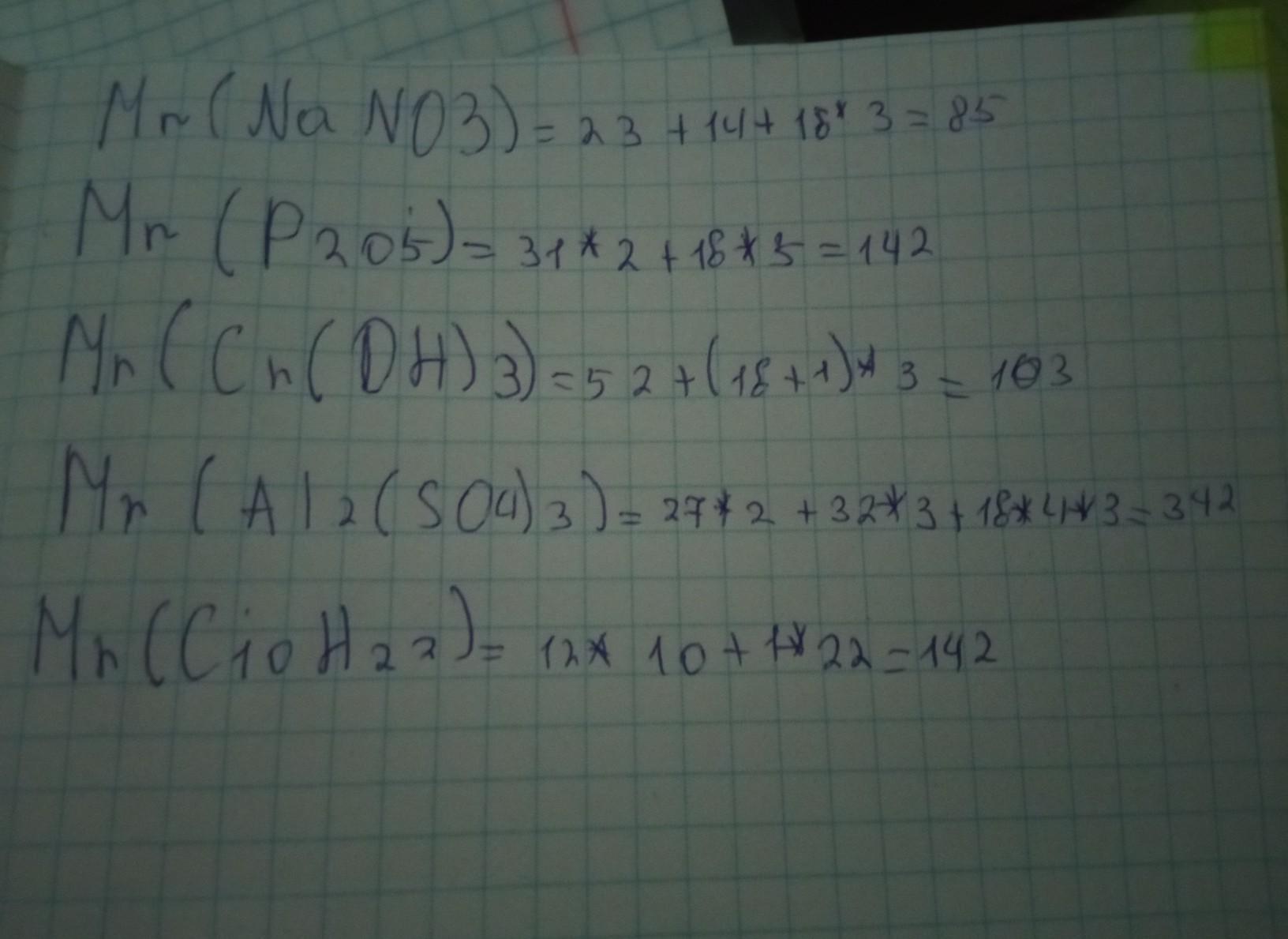 обчислити відносну молекулярну масу: NaNO3, P2O5, Cr(OH)3, Al2(SO4)3, C10H22