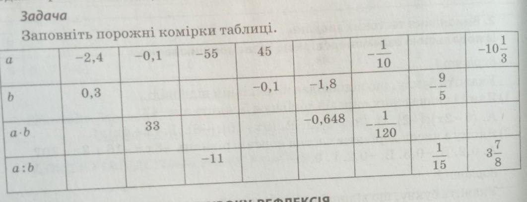 a b Задача Заповніть порожні комірки таблиці. -55 45 a.b a:b -2,4 0,3 -0,1 33 -11 -0,1 -1,8 -0,648 1 10 1 120 95 1 15 1 3 -10- 3- 78