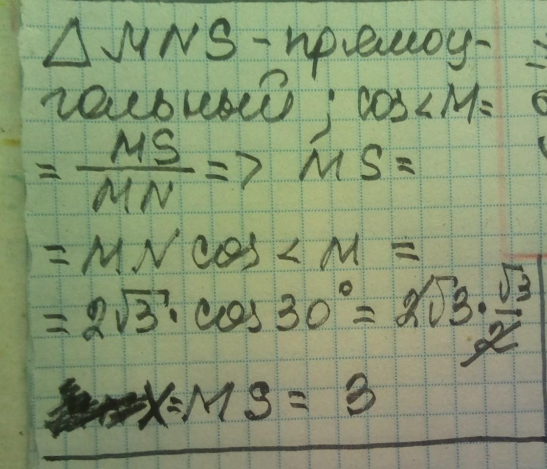 МS=√(MN²-NS²)=√((2√3)²-(√3)²)=