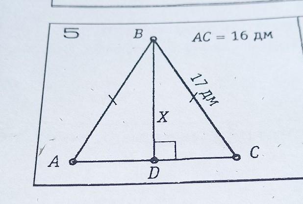 поскольку треугольник равнобедренный => AD = DC = 1/2 AC =8, ну а дальше по т. Пифагора из треугольника BDC находим х