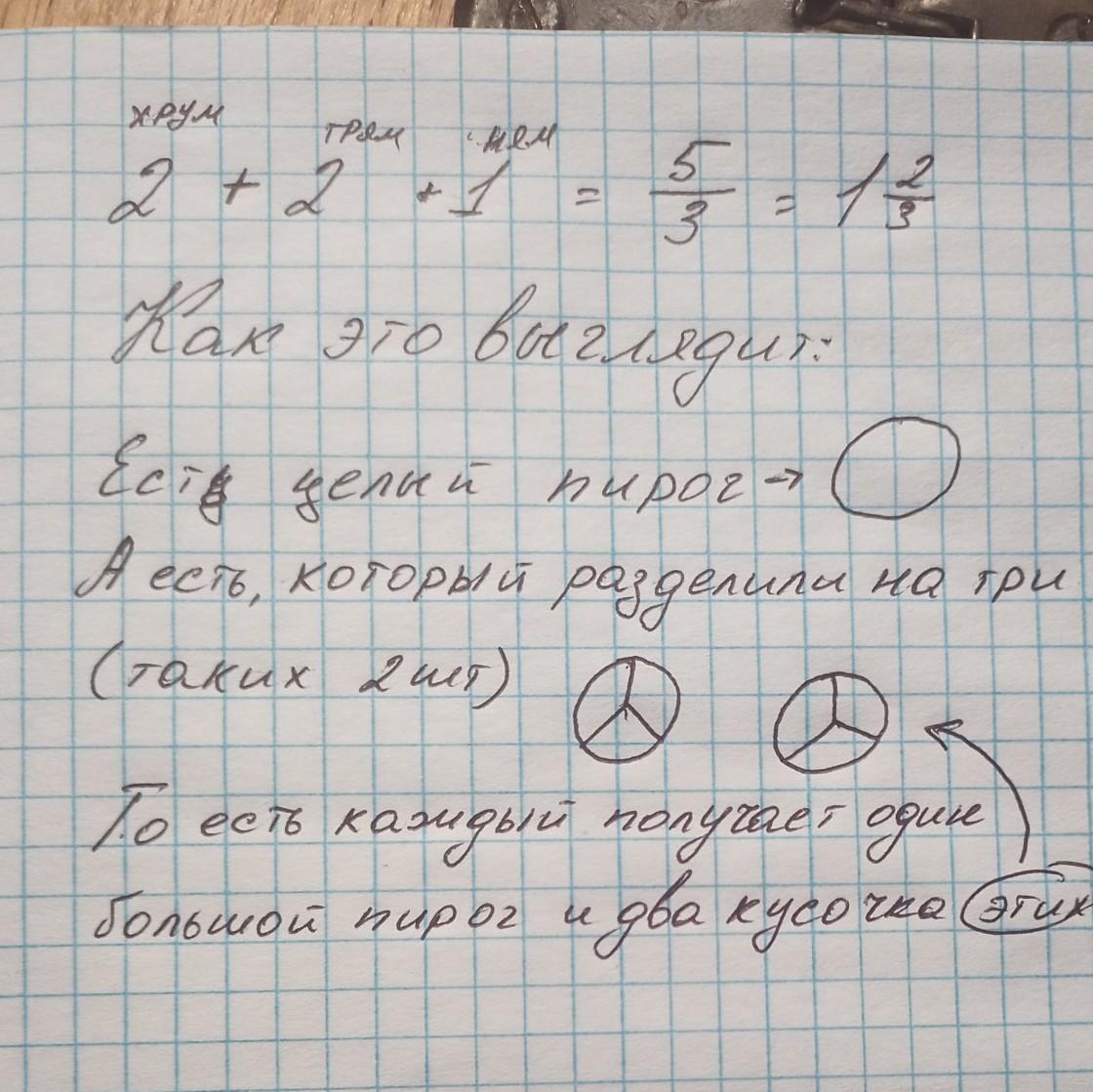 ненажерки хрум, трям і ням вирішили на свято спекти пироги. хрум випік 2 пироги, i трям 2, а ням зміг спекти тільки 1 пиріг. як м поділити порівну 5 пирогів на трьох? яку частину від усіх пирогів отримає кожен?