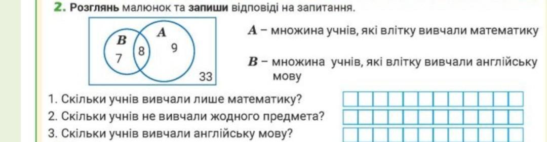 мени завданя через 30 хвылин здаваты пж допоможіть 1. Скільки учнів вивчали лише математику? 2. Скільки учнів не вивчали жодного предмета? 3. Скільки учнів вивчали англiйсьky MOBy?