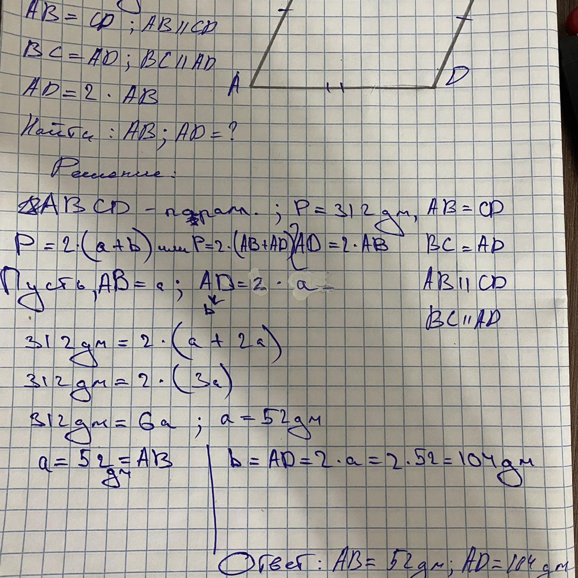Периметр паралелограма дорівнює 312 дм. Одна сторона довша за другу в 2 рази. Обчисліть усі сторони паралелограма