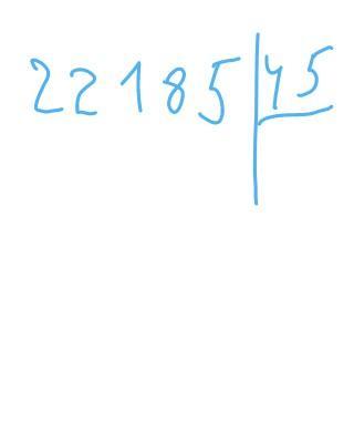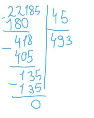 22185÷45 . для того чтобы было легче мы должны делить по двух значным числам . но в нашем случае мы будем брат трех значное число так ка 45 больше 22 .и у нас будет 221. так мы берем по 4 так как по 5 это много , а по 3 мало . 45×4 =180 . 221-180 =41 .так 41 меньше 45 , 8 спускается и получается у нас 418 . в этот раз берем по 9 по восем мало а по десять много . 45×9=405 .418-405=13 . 13 меньше 45 , поэтому 5 спускается и унас получается 135 . в этот раз берем по три 45×3 =135 . 135-135 =0