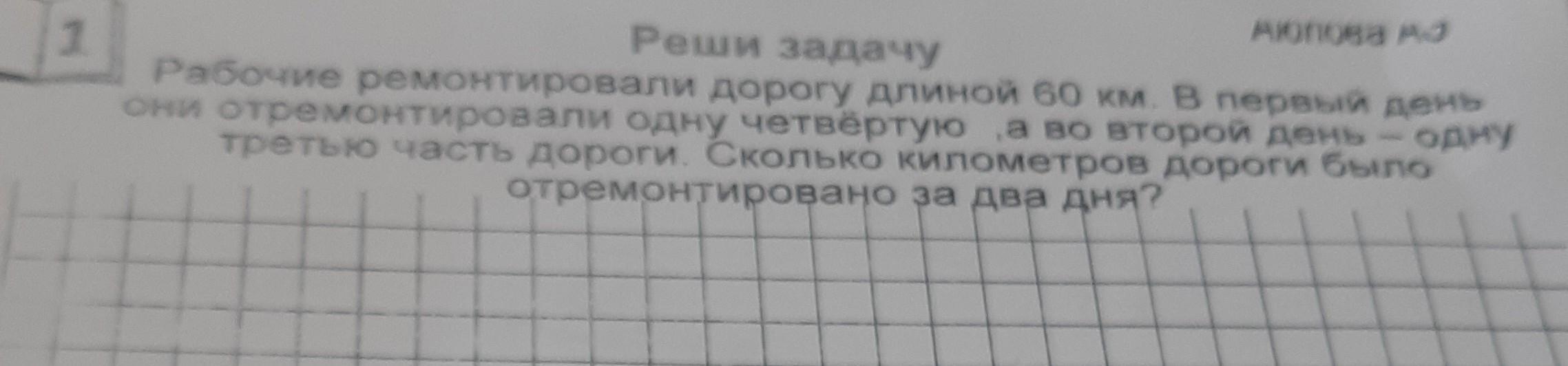 Аюпова А Реши задачу Рабочие ремонтировали дорогу длиной 60 км. В первый день они отремонтировали одну четвёртую, а во второй день - одну третью часть дороги. Сколько километров дороги было отремонтировано за два дня?