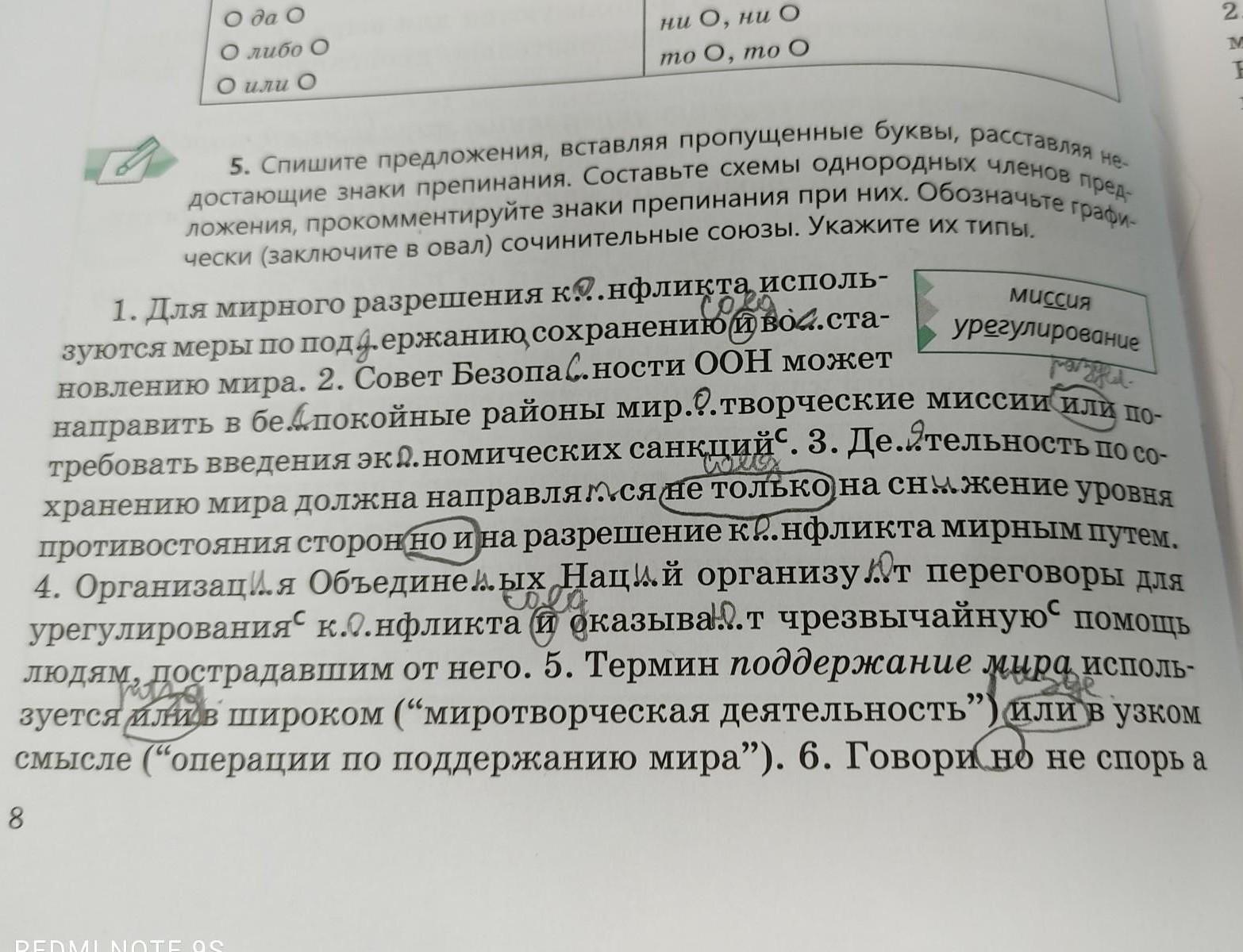 5. Спишите предложения, вставляя пропущенные буквы, расставляя не- достающие знаки препинания. Составьте схемы однородных членов пред- ложения, прокомментируйте знаки препинания при них. Обозначьте графи- чески (заключите в овал) сочинительные союзы. Укажите их типы. 1. Для мирного разрешения к...нфликта исполь- зуются меры по под...ержанию сохранению и во...ста- новлению мира. 2. Совет Безопа...ности ООН может направить в бе...покойные районы мир...творческие миссии или по- требовать введения эк...номических санкций . 3. Де...тельность по со- хранению мира должна направля...ся не только на сн...жение уровня противостояния сторон но и на разрешение к...нфликта мирным путем. 4. Организац...я Объедине...ых Нац...й организу...т переговоры для урегулирования к...нфликта и оказыва...т чрезвычайную помощь людям, пострадавшим от него. 5. Термин поддержание мира исполь- зуется или в широком (“миротворческая деятельность") или в узком смысле (“операции по поддержанию мира”). 6. Говори но не спорь а