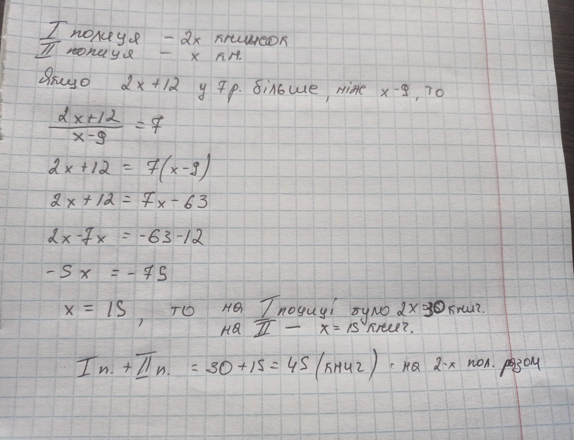 " Якщо з другої полички забрати 9 книжок, а на першу доставити 12 книжок, то на другій поличці стане у 7 разів менше книжок, ніж на першій." математично