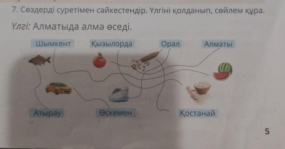 Атырауда балық көп,өскеменде машиналар бар,қостанайда егін екендер көп,орал қайықтар жүзеді,шымкентте қарбыздар көп сатады,Алматыда алма өседі,қызылоррда пдамдар күрішпен айналасады.