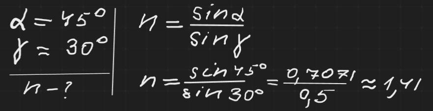 заломлення, якщо кут падіння променя дорівнює 450, а кут заломлення-30º.