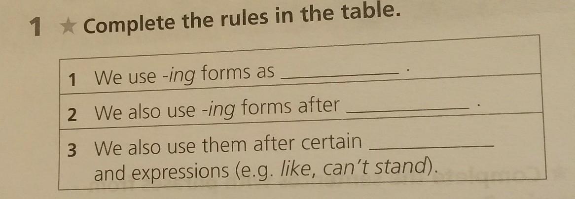 1 1 ★ Complete the rules in the table. 1 We use -ing forms as 2 We also use -ing forms after 3 We also use them after certain and expressions (e.g. like, can't stand).