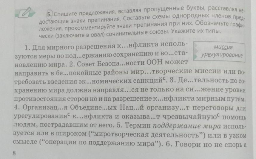 5. Спишите предложения , вставляя пропущенные буквы , расставляя не знаки препинания . Составьте схемы однородных членов пред ложения , прокомментируйте знаки препинания при них . Обозначьте графи чески ( заключите в овал ) сочинительные союзы . Укажите их типы достающие 1. Для мирного разрешения к ... нфликта исполь зуются меры по под ... ержанию сохранению и во ... ста новлению мира . 2. Совет Безопа ... ности ООН может направить в бе ... покойные районы мир ... творческие миссии или по требовать введения эк ... номических санкций . 3. Де ... тельность по со хранению мира должна направля ... ся не только на сн ... жение уровня противостояния сторон но и на разрешение к ... нфликта мирным путем . 4. Организац ... я Объедине ... ых Нац ... й организу ... т переговоры для урегулирования к ... нфликта и оказыва ... т чрезвычайную помощь людям , пострадавшим от него . 5. Термин поддержание мира исполь зуется или в широком ( " миротворческая деятельность " ) или в узком смысле ( " операции по поддержанию мира " ) . 6. Говори но не спорь хоть спорь да не вздорь . ( Пословица ) 7. В спорах нет ни высших ни низших ни званий ни имен : важна только истина , перед которой рав ны все . ( Р. Роллан )