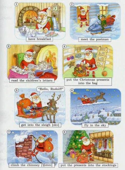 36.(с.61)Look at the pictures and answer the question: "What did Santa Claus do yesterday?"