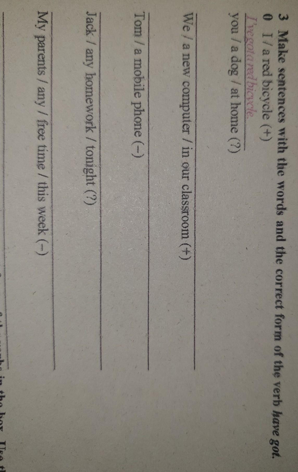 Ответ:we have got a new computer in our classroom. Tom hasnt a mobile phone. Has got Jack any homework tonight? My parents havent got any free time this