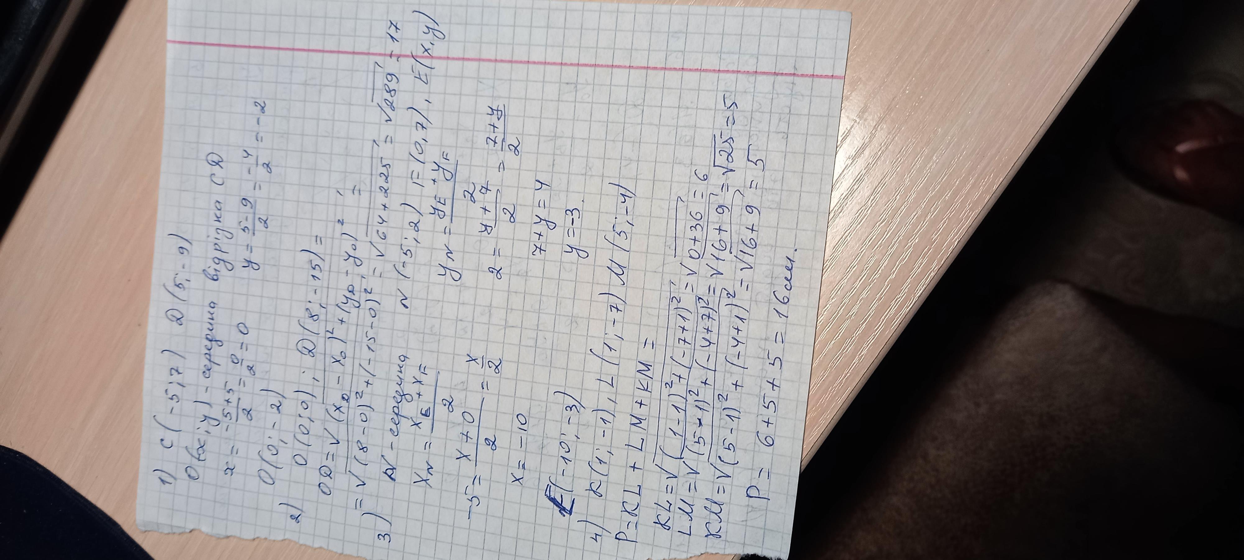 1. Знайдіть координати середини відрізка CD, якщо C (-5; 7) і D (5; -9). 2. Знайдіть відстань від початку координат до точки D ( 8; -15). 3. N - середина відрізка EF. Знайдіть координати точки E, якщо N(-5; 2), F (0; 7). 4. Знайдіть периметр трикутника KLM, якщо K (1; -1), L (1; -7), M (5; -4). 5. Точки A( 3; -1), B (4; 9), C (-3; 7) – вершини паралелограма ABCD. Знайдіть координати вершини D. 6. Знайдіть на осі ординат точку, рівновіддалену від точок А(3; 0) і В(7;4).