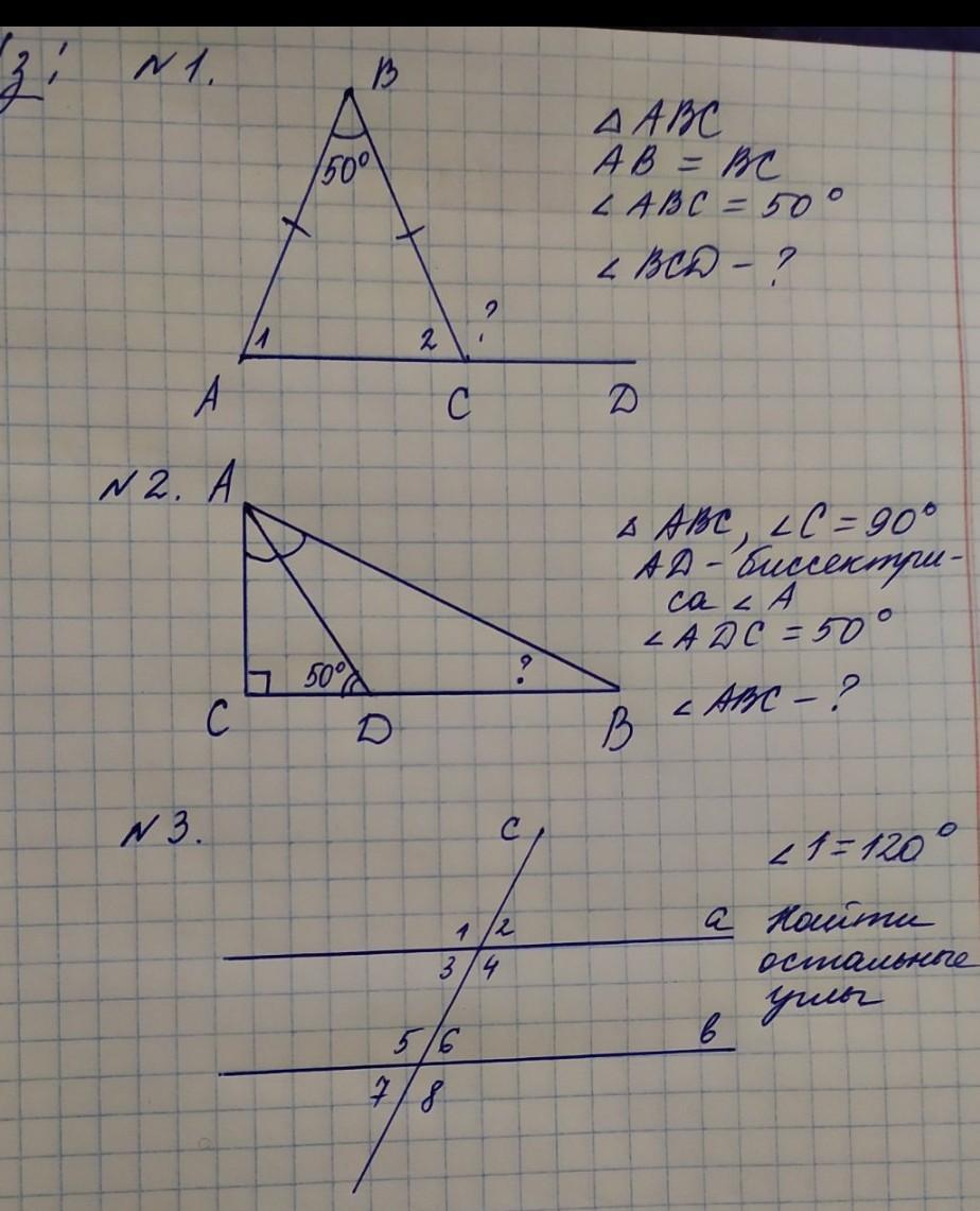 N1: сумма внутренних углов равна 180°, углы ВАС и АСВ равны естественно, то 180°-50=130:2=65°. Углы ВАС и АСВ=65°. Теперь нужно найти угол ВСD. 180-65=115°, так как BCD и АСВ - смежные углы