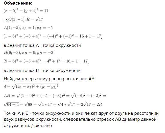 СРОЧНО! Докажите, что отрезок AB является диаметром окружности (x-5)^2+(y+4)^2=17, если A (1;-5), B (9;-3)