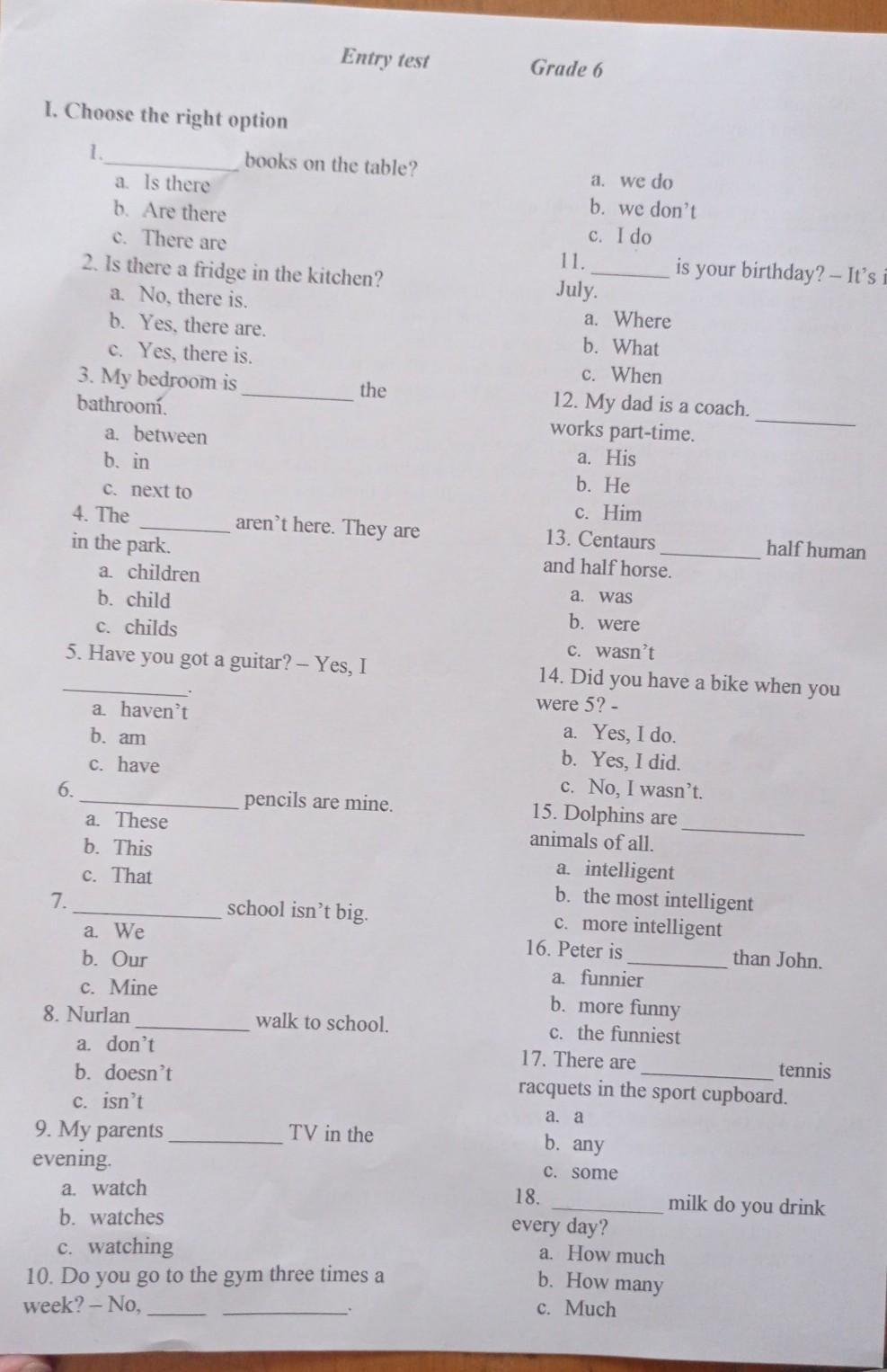 1. 6. 7. a. Is there b. Are there e. There are 2. Is there a fridge in the kitchen? a. No, there is. b. Yes, there are. c. Yes, there is. 3. My bedroom is bathroom. a. between b. in c. next to 4. The in the park. a. b. child children c. childs 5. Have you got a guitar? - Yes, I a. haven't b. am c. have a. These b. This c. That a. We b. Our c. Mine 3. Nurlan books on the table? a. don't b. doesn't c. isn't My parents vening. a. watch b. watches the aren't here. They are pencils are mine. school isn't big. walk to school. TV in the c. watching Do you go to the gym three times a zek? - No, a. we do b. we don't c. I do 11. July. a. Where b. What c. When 12. My dad is a coach. works part-time. a. His b. He c. Him 13. Centaurs and half horse. a. was b. were is your birthday? - c. wasn't 14. Did you have a bike when you were 5? - a. Yes, I do. b. Yes, I did. c. No, I wasn't. 15. Dolphins are animals of all. a. intelligent b. the most intelligent c. more intelligent 16. Peter is a. funnier b. more funny c. the funniest 18. every day? half hum a. How much b. How many Much c. 17. There are racquets in the sport cupboard. a. a b. any c. some than John. tennis milk do you drink
