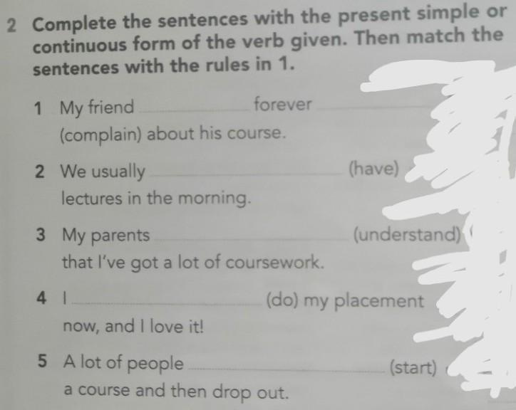 1. My friend is always complaining about his course 2. We usually have lectures in the morning 3. My parents understand 4. I'm doing my placement 5. A lot of people start