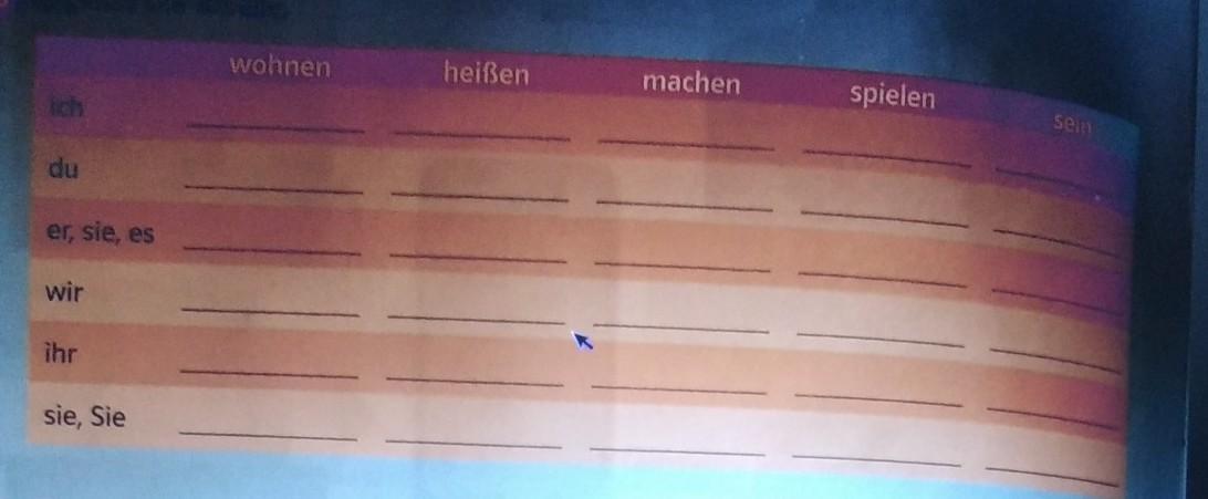 Ergänze die Tabelle. ich du er, sie, es wir ihr sie, Sie wohnen heißen machen spielen
