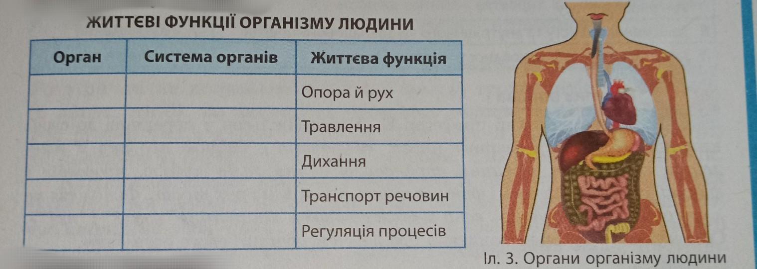 Завдання 2. Розгляньте ілюстрацію 3, розпізнайте зо- бражені на ній органи. За- повніть таблицю й зробіть ви- сновок про організм людини як біологічну систему.