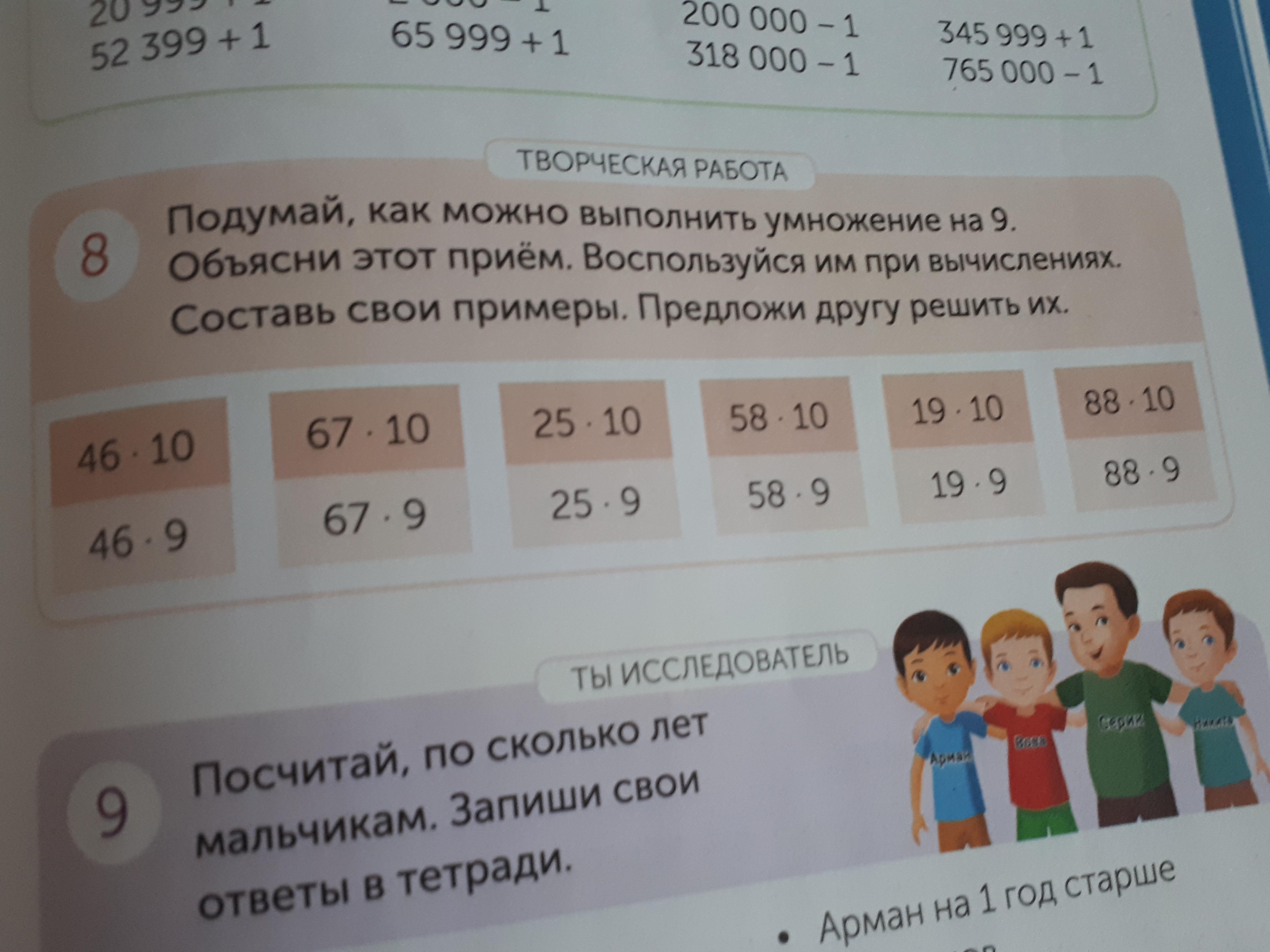Ответ: 46×9=414, 67×9=603, 25×9=225, 58×9=522, 19×9=171, 88×9=792