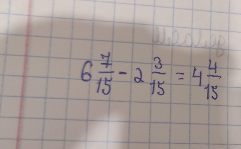 Смотри там равное значение знаменателей 15 и 15, если равное количество знаменателей, то знаменатель не отнимается или плюсуется, а остаётся таким же. Нужно решить только верхние