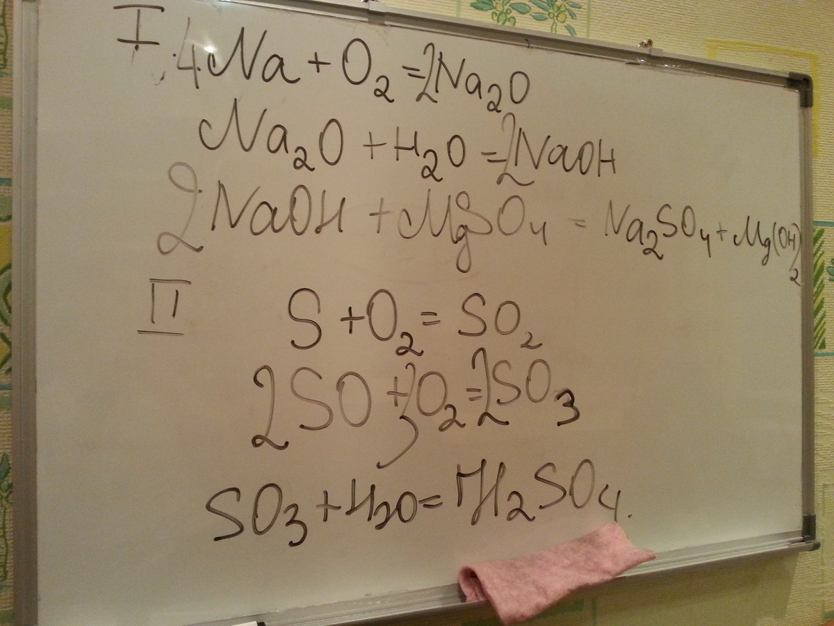 4Na+O2=2Na2O Na2O+H2O=2NaOH 2NaOH+H2SO4=Na2SO4=+2H2O