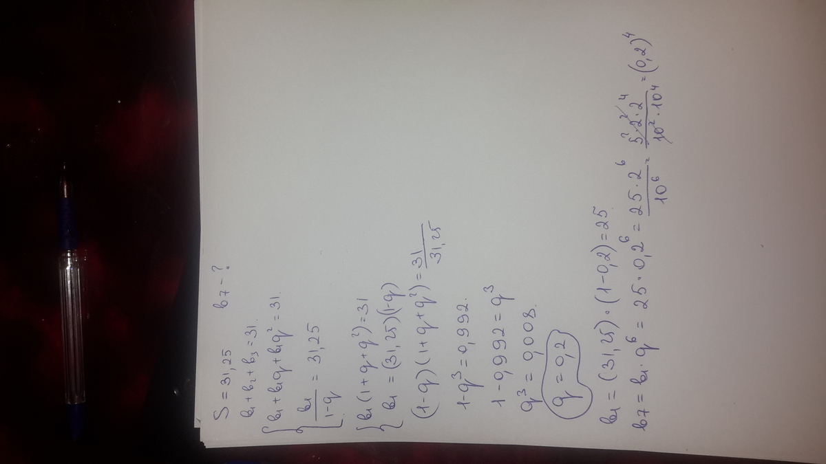 Как найти седьмой член бесконечной геометрической прогрессии,если её сумма равна 31,25,а сумма первых трёх членов равно 31?(формула нахождения суммы Sn=b1/1-q)