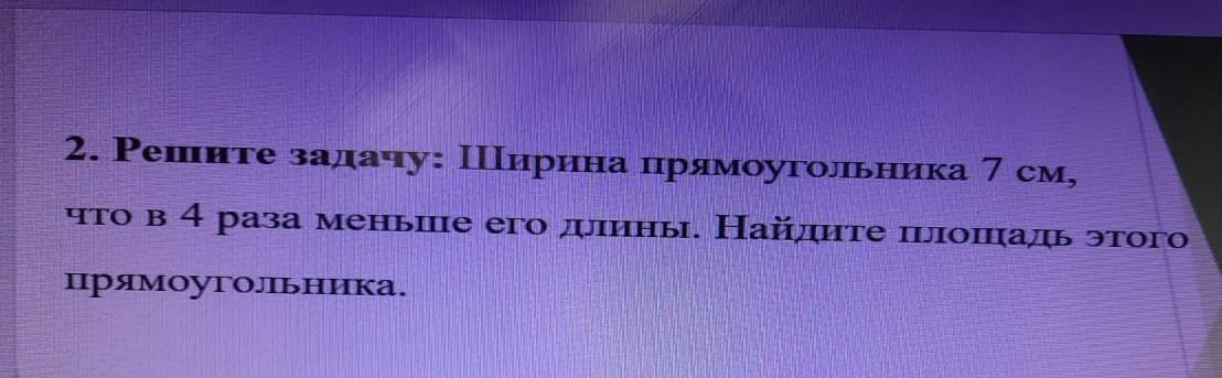 2. Решите задачу: Ширина прямоугольника 7 см, что в 4 раза меньше его длины. Найдите площадь этого прямоугольника.